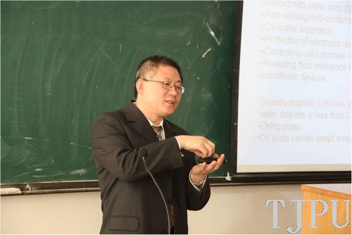 在报告会中,林童教授主要介绍了课题组在织物表面改性处理,制备超憎水、超憎油、单面导水及导油功能性整理织物的研究进展情况,并发现在紫外光照射下,可以使超憎水、憎油低表面能的界面对不同的油和水具有选择性通过等性能,同时该界面在特定条件下,具有自修复功能。该发现创建了液体通过新理论,该理论最终在natural杂志的子期刊上发表。