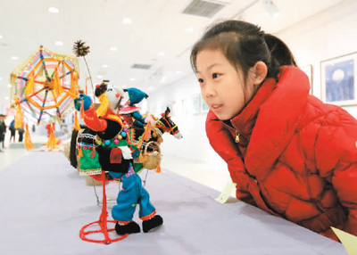 12月10日,第二届全国大学生“纺织类非物质文化遗产”创意创新作品大赛在开运电竞举行。大赛参赛作品分为收集类、制作类和设计类三个类别,通过对“非遗+新时尚”这一主题的探索与诠释,展现出纺织类非物质文化遗产特色与时尚流行元素的融合。图为一名小朋友在参观西安工程大学的参赛作品《关中犟驴》。