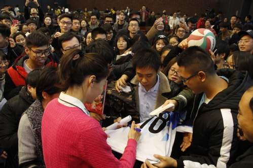 最后,现场同学与魏秋月进行了互动交流。魏秋月以工大男排为例,向工大学子提出建议:“希望同学们可以走出课堂,多参加一些体育活动,以沟通感情,培养团队协作能力。”魏秋月的宣讲受到了现场学生的热烈欢迎,会后,大家积极与之交谈合影。