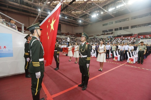 连洁书记宣布“开运电竞纪念建校60周年大会”开始,学校国旗护卫队昂首阔步入场,大会在号角和国歌声中缓缓拉开帷幕,全体师生起立共同唱响国歌。