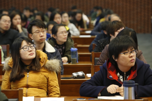 报告中,张教授以习近平新时代中国特色社会主义思想的重大意义为主线,深刻阐述了新时代的主要维度和标志、新思想的主要贡献和意义、新认知的主要使命和遵循。张教授重点讲解了如何从三个维度理解“新时代”:第一个维度是 “近代以来久经磨难的中华民族迎来了从站起来、富起来到强起来的伟大飞跃,迎来了实现中华民族伟大复兴的光明前景”;第二个维度是“科学社会主义在二十一世纪的中国焕发出强大生机活力,在世界上高高举起了中国特色社会主义伟大旗帜”;第三个维度是“中国特色社会主义道路、理论、制度、文化不断发展,拓展了发展中国家走向现代化的途径,给世界上那些既希望加快发展又希望保持自身独立性的国家和民族提供了全新选择,为解决人类问题贡献了中国智慧和中国方案”。张教授指出,新的时代必然孕育新的思想,也必然需要新的思想来指导。习近平新时代中国特色社会主义思想正是在这种新的时代背景下应运而生,回答了时代主题“新时代坚持和发展什么样的中国特色社会主义、怎样坚持和发展中国特色社会主义”。张教授严谨的逻辑思维能力、博古通今的学识水平让人折服,赢得在场干部教师的阵阵热烈掌声。