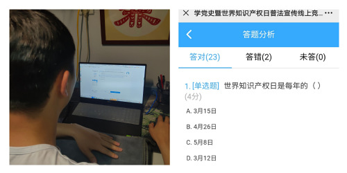 开展世界知识产权日普法线上竞答活动。425日至30日,结合学校党史学习教育,以世界知识产权日为契机,法学院/知识产权学院推出了“学党史 悟思想 办实事 开新局”暨世界知识产权日普法线上竞答活动,试题内容涉及党史、民法典、著作权法、专利法、商标法等相关知识。师生们热情高涨、广泛参与,学习党史、领悟新知,通过竞答形成比学赶超的浓厚氛围。