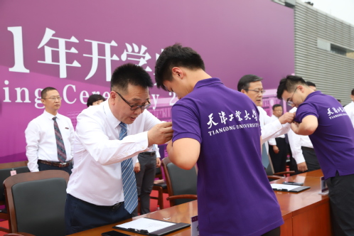 校党委书记俞绍平、校长夏长亮院士为新生代表佩戴校徽。2021级新生同时将崭新的校徽佩戴于胸前,正式拥有了“天工人”的新名字新身份,誓言担负起努力学习、增长才干,为天工增光添彩的新使命。