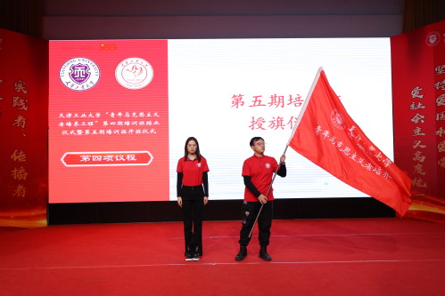 今年我校遴选出44名“青马工程”第五期学员,学员代表郝建勇从“青马工程”第四期学员王雅琳手中接过“青马工程”培训班班旗,标志着“青马工程”第五期培训班正式启动。类晶婕同学代表第五期培训班学员发言后,冯宇航、刘润泽、施雅萱和何桠楠用诗朗诵《追梦百年 筑梦青马》表达了青马学员的爱党之情与强国之志。