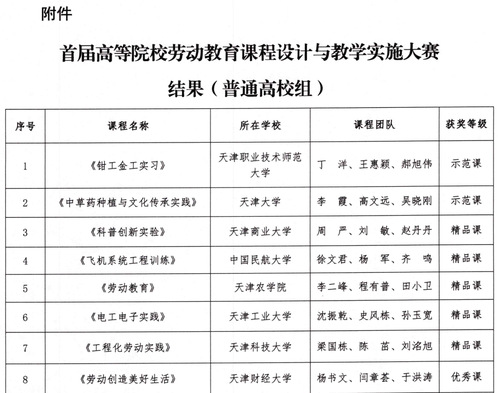 近日,市教委公布了“天津市首届高等院校劳动教育课程设计与教学实施大赛”获奖名单。我校沈振乾老师团队的《电工电子实践》课程获批天津市首届高等院校劳动教育课程设计与教学实施大赛精品课,为获批的9门精品课程之一。