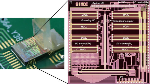 为解决该难题,张赞允教授及其研究团队创新性地提出了基于光栅耦合的8通道Lan-WDM硅光收发集成方案,集成芯片(b)采用自研超高效率完全垂直光栅耦合器作为光学接口,采用交错型角度多模干涉仪实现超低损耗波分复用/解复用,采用硅马赫-曾德调制器和锗波导光电探测器实现高速光发射和光接收功能。经光封装后(a)测试,芯片发射端光纤到光纤插入损耗仅约12 dB,信道非均匀度为1.44 dB;调制器和探测器带宽分别达到了4547 GHz;在满足SD-FEC判决标准的前提下,光发射机和光接收机总通信容量分别达1.561.42 Tb/s,收发互连后总通信容量仍然高达1.18 Tb/s。为验证芯片在传输距离方面的优势,团队分别进行了2公里和10公里数据传输实验。结果显示,得益于Lan-WDM波段的低光纤色散,收发芯片可实现10 公里的单模光纤数据传输。