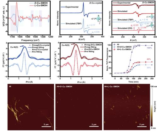 传统的X-射线及电子衍射等技术无法表征具有亚纳米尺度和非周期结构的[D(L)-Cu-SMOHs]材料。基于此,该研究还提出电子顺磁共振(EPR)结合X-射线吸收精细结构(XAFS)的组合表征方法,明确解析了D(L)-Cu-SMOHs的几何构型、电子构象和配位环境等结构信息。此外,电子圆二色(ECD)和振动圆二色性(VCD)也验证了[D(L)-Cu-SMOHs]螺旋特征的保留。受益于暴露的活性位点和手性螺旋特征,D(L)-Cu-SMOHs通过熵驱动的疏水相互作用,能够有效地抑制淀粉样纤维化,并表现出明显的对映体选择特性,为神经退行性疾病的治疗开辟了新途径。