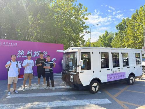 与此同时,一辆无人驾驶摆渡车正沿着预设路线平稳运行——这是计算机科学与技术学院与校企合作单位天津深维思索智能科技有限公司联合研发的最新成果。它安静地往返于报到点与宿舍区之间,在往复穿梭中,无声传递着科技带来的便捷与温度。