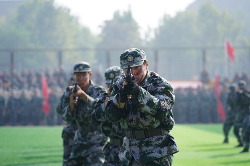 汇报大会在庄严的升国旗仪式中拉开序幕。20个分列式方队以整齐划一的步伐、高亢嘹亮的口号依次通过主席台,充分展现了天工学子朝气蓬勃、奋发向上的精神风貌。在军事技能汇报展示中,女子匕首术刚柔并济,一招一式诠释巾帼不让须眉的飒爽英姿;战术方阵持枪匍匐、翻越障碍,班组协同战术演示将汇报大会推向高潮,赢得现场师生热烈掌声;男子刺杀操方阵由500名2025级新生组成,动作刚猛有力、气势如虹,突刺格挡间彰显敢打必胜的坚定信念。